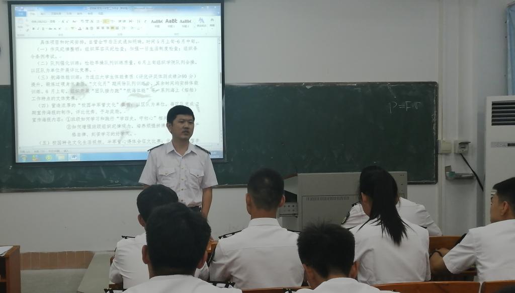 首先,刘抒睿讲评4月份各中队的半军事化管理情况;布置学院将在5月份举行的“半军管文化月”工作安排。目的通过组织作风纪律整顿、军容风纪检查、条令条例考试等,进一步增强同学们的组织纪律观念。强化队列、体能等训练,锻炼同学们过硬的身体素质。开展的“半军管”特色文体活动,航海技能比赛、征文比赛、校园生活(视频、板报)展映等营造浓厚的半军事化管理氛围,使半军事化管理育人目标和理念,深深扎根每一名新同学心中。随后,江涛教育各位学生干部,要提高自身工作标准、团结同学、积极发挥好模范带头作用,严格落实半军事化管理制度,努力把每一个区队都建设成为优秀的班集体。