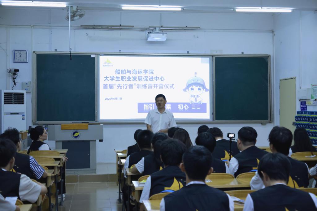 在海滨校区教学楼101室举办首届“先行者训练营”开营仪式,学院正处级辅导员、党委副书记齐昊,辅导员刘爽、黄荔、邓海漫、陈方园及30 余名训练营营员参加了活动。